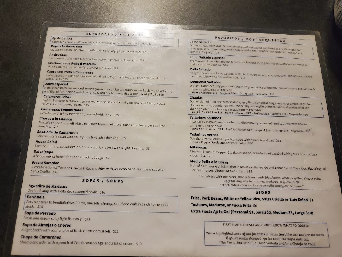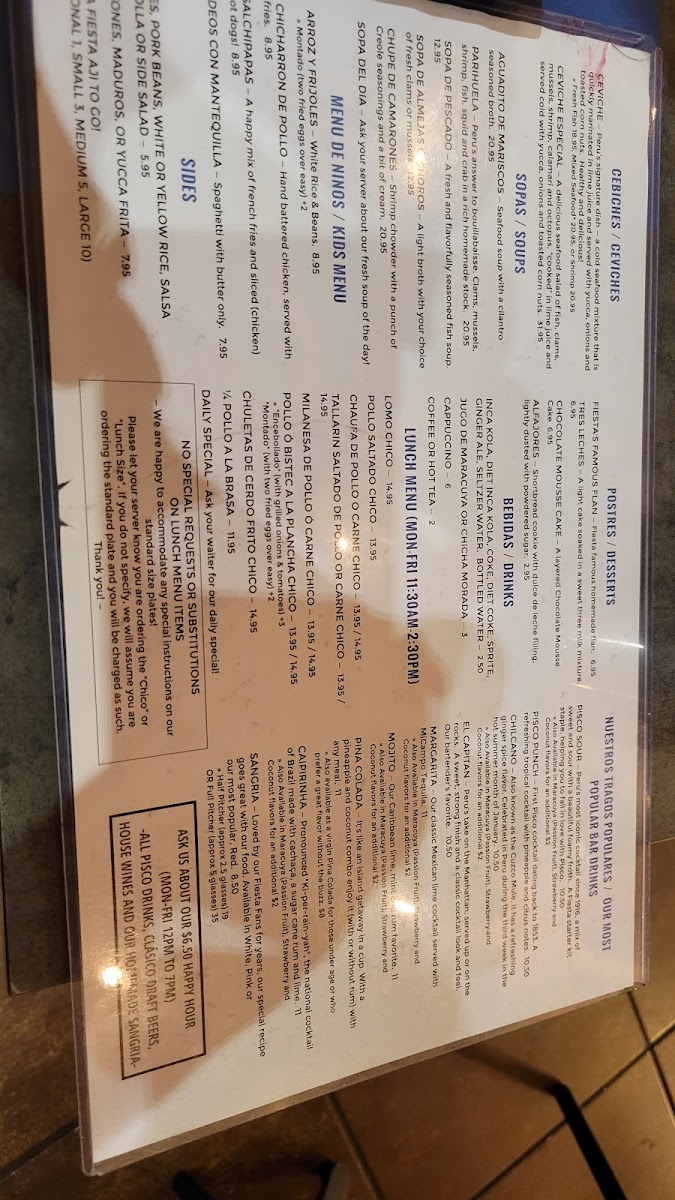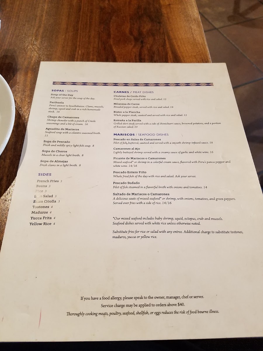 Peru’s answer to bouillabaisse. A bowl of clams, mussels, shrimp, fish, squid and crab in a rich homemade stock. (No substitutions or special requests on the lunch menus)